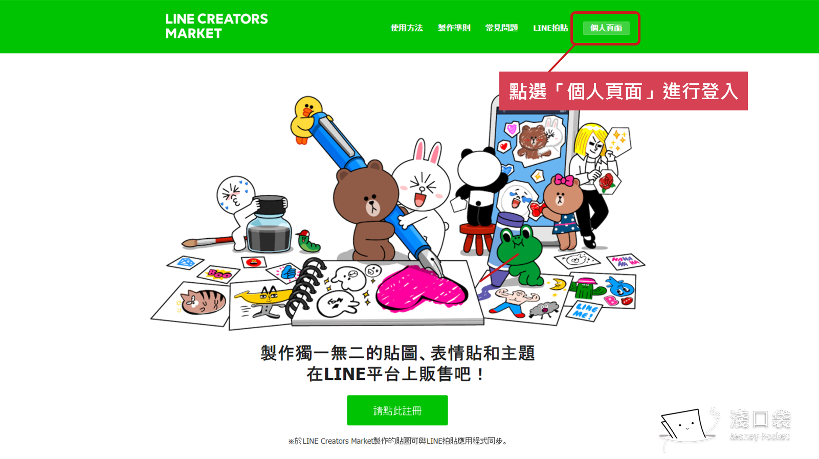 還記得之前小編請大家先註冊一個創意人帳號嗎? 我們要在這邊進行上架,點選 LINE Creators Market 的「個人頁面」進行登入。