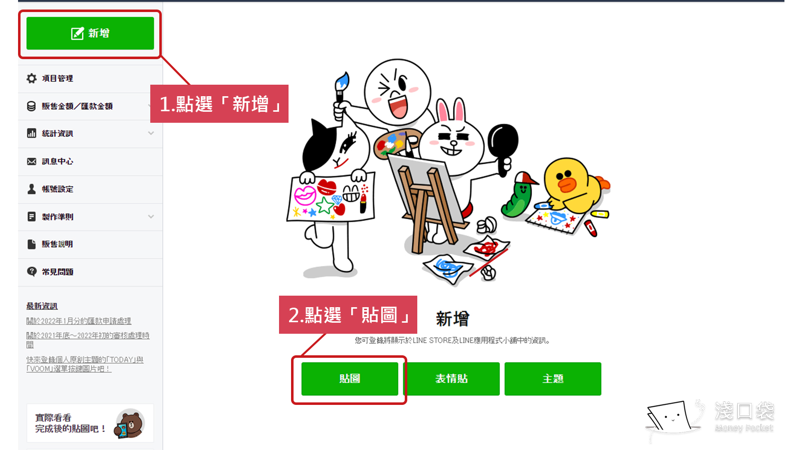 ▼ 1.登入後先點選左側選單的「新增」,會跳出選項,點選「貼圖」。