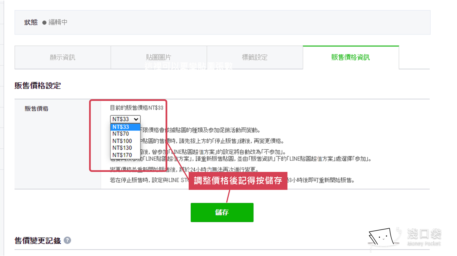 ▼ 8. 接下來最後就是設定價格啦!一般一組40張貼圖是賣33元,當然你也可以賣貴一點,但就看有沒有人願意買單囉XDD