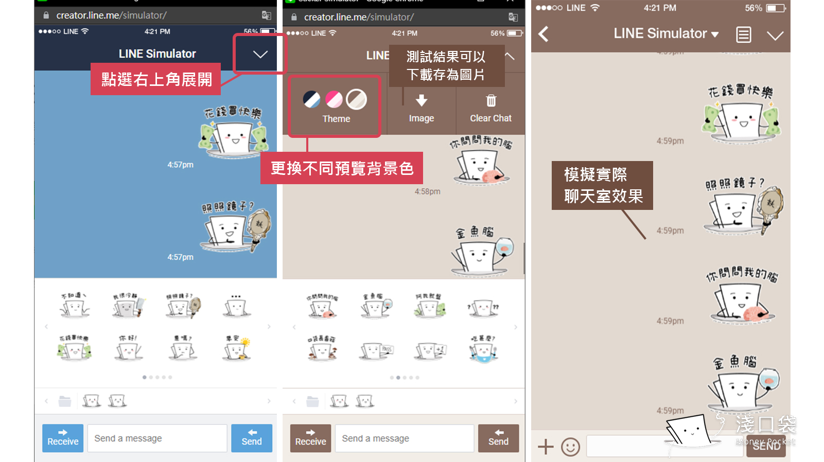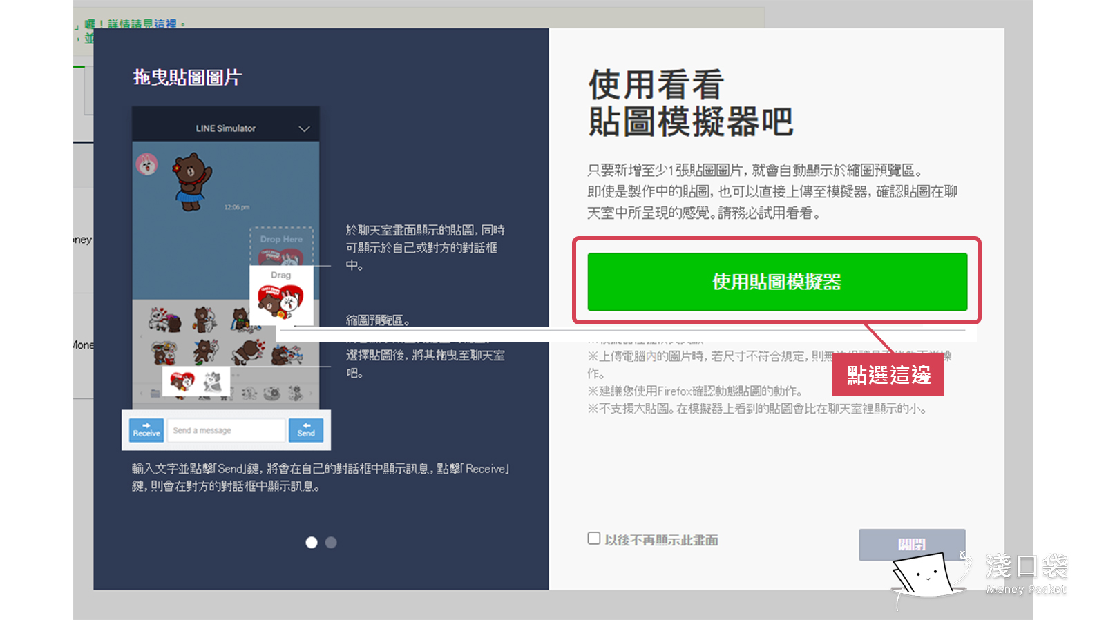 且慢!在貼圖送出審核先別衝動!😁 Line提供貼圖模擬器可以使用,可以測試看看貼圖在聊天室使用上大概會呈現的樣子,另外因為送出審核後就不能編輯了,所以建議可以每個都至少測試一輪~