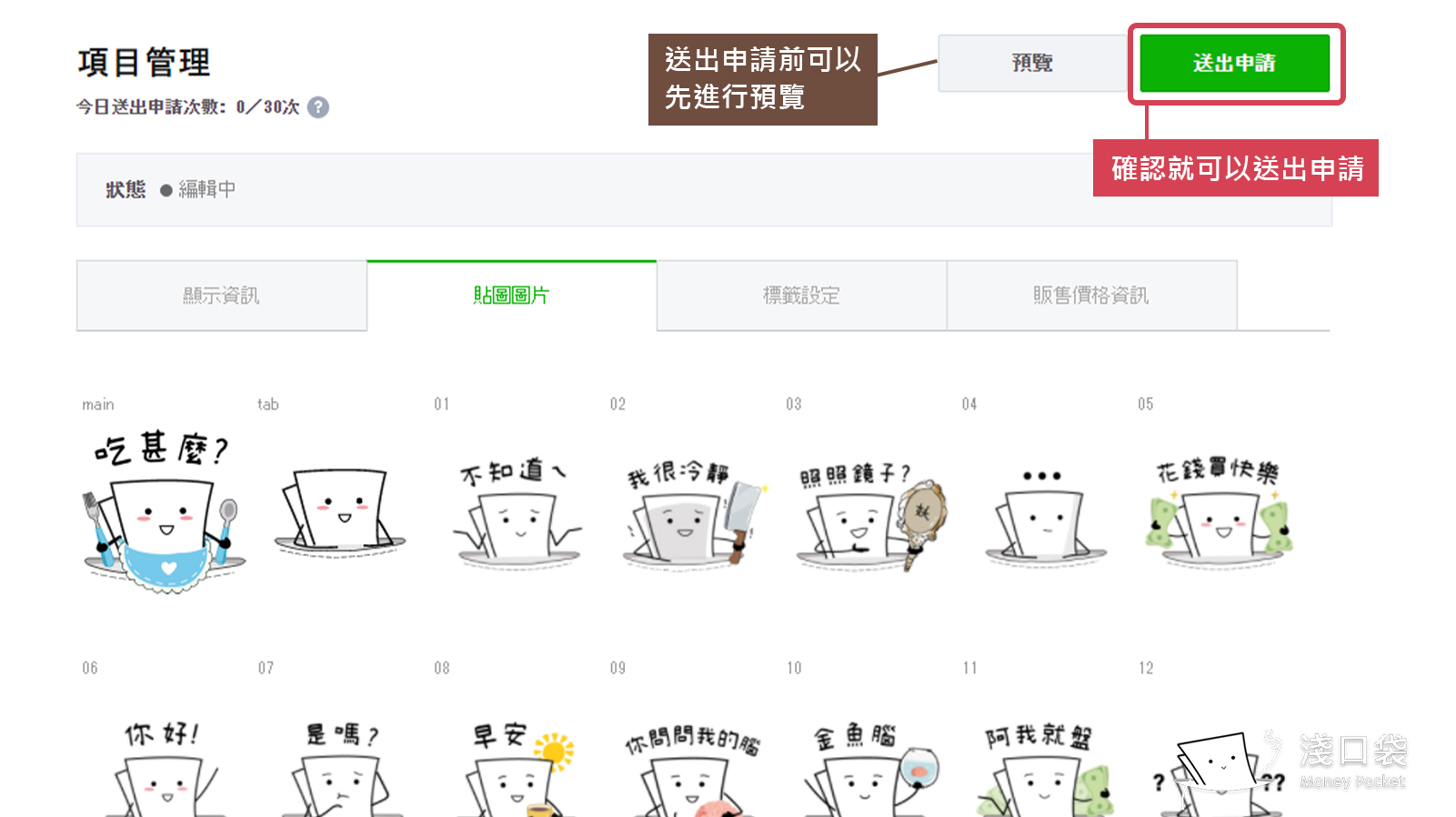 ▼ 10. 測試完後我們就可以回到貼圖圖片,做最後一次的檢查,可以點選預覽,看在貼圖小舖呈現的大概畫面,確認都沒問題就按送出申請