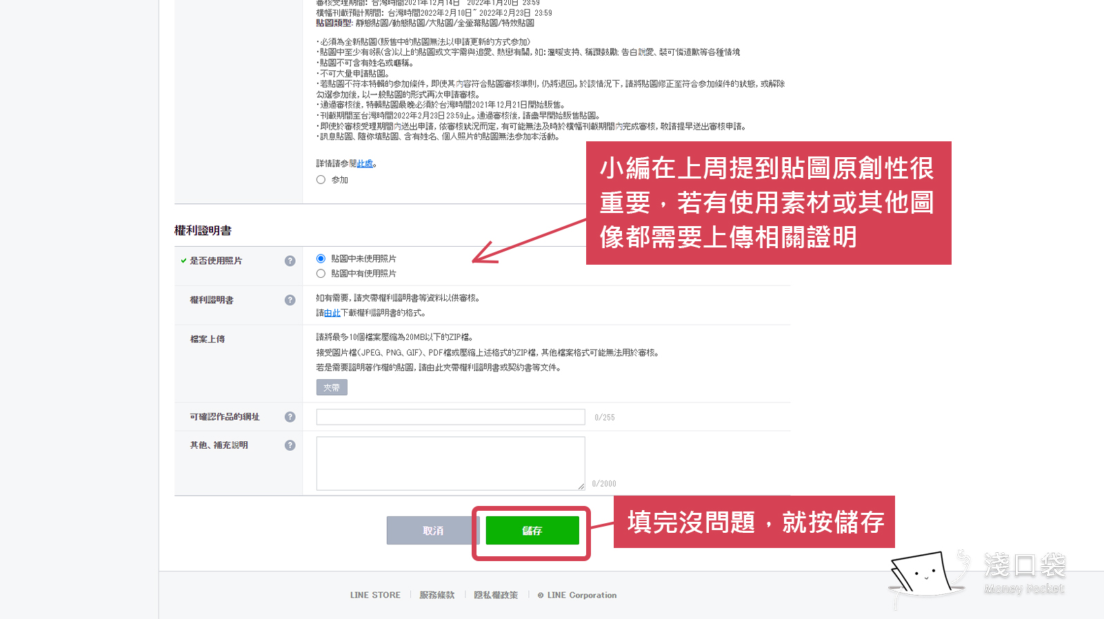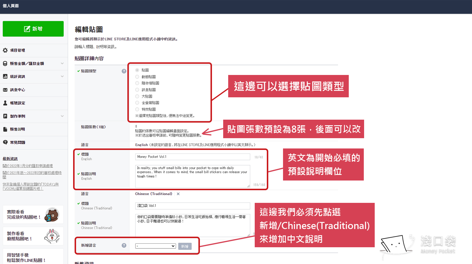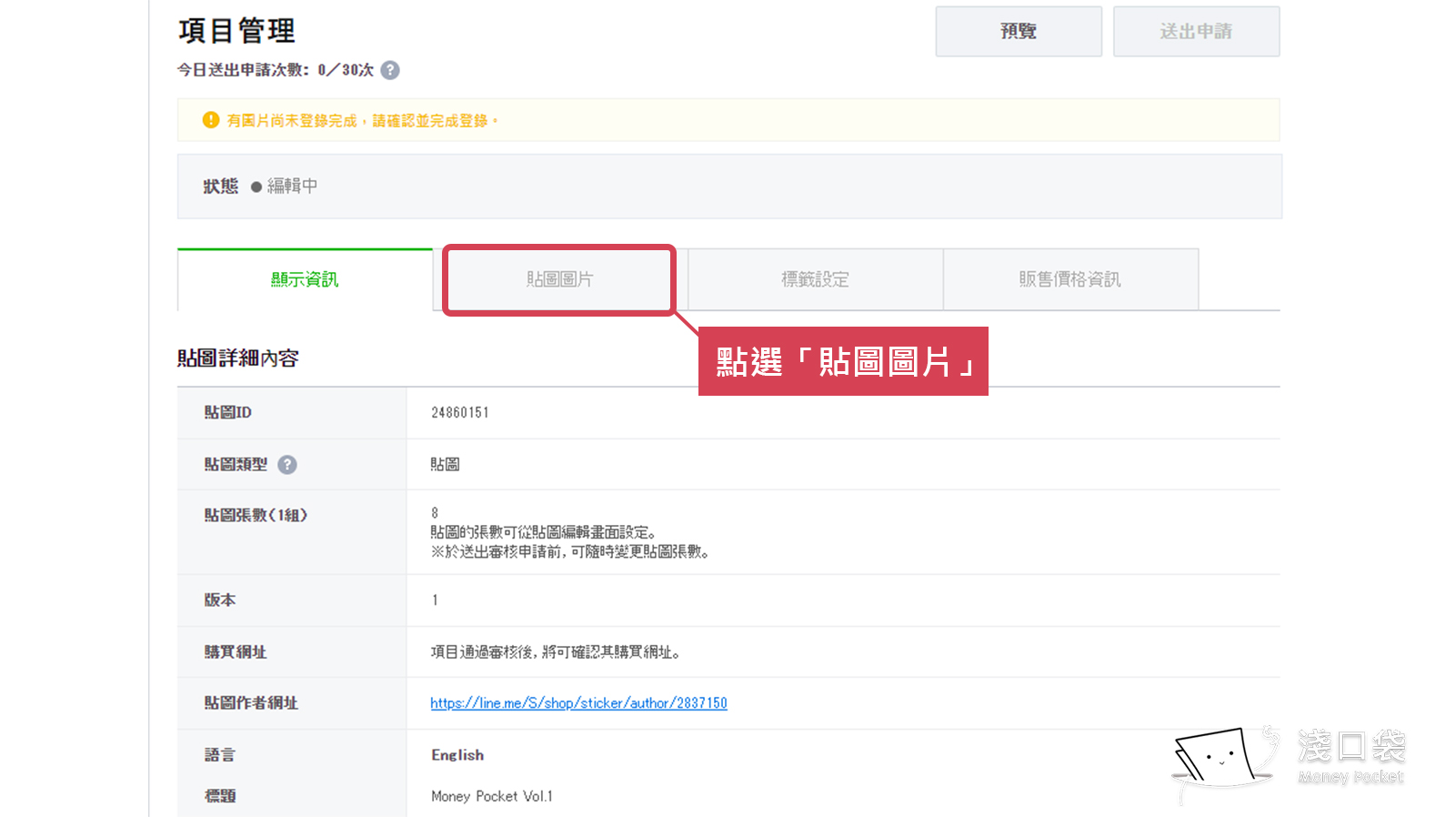 ▼ 2.再來就是要填我們貼圖的基本資料,這邊要好好填仔細喔!如果之後送出審核就不能隨意更動了,如果沒填好也會被退回來。