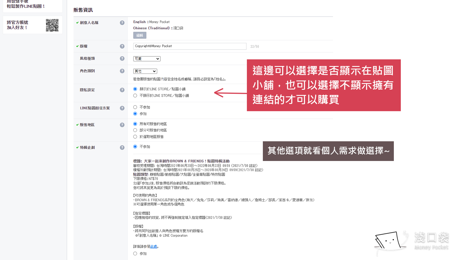 ❋ 可於隱私設定修改,選擇為「不顯示於LINE STORE/貼圖小舖」,僅擁有連結的用戶可以瀏覽並購買商品。