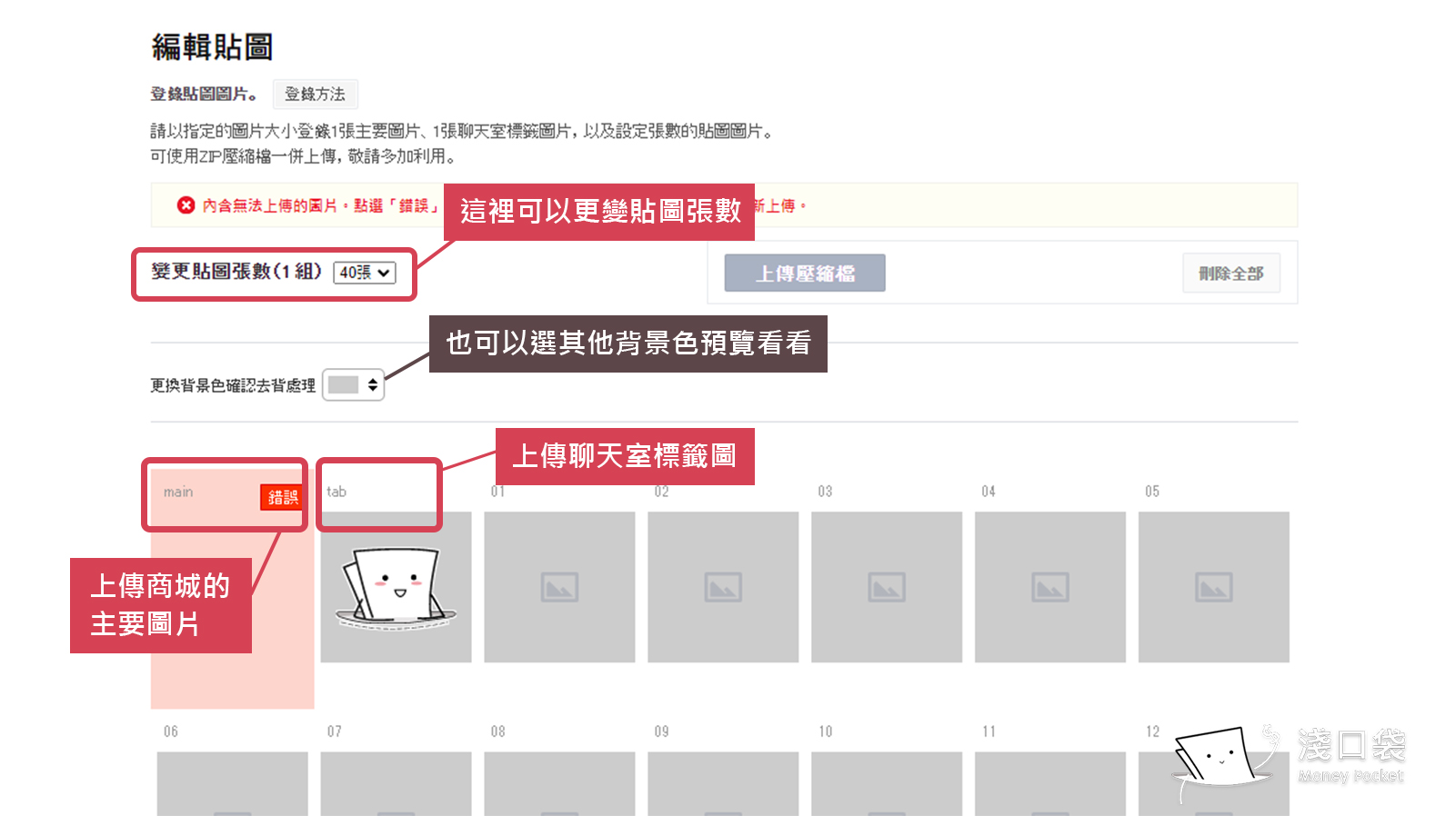 ▼ 5.上一周我們有講到主要圖片和標籤、貼圖都有規定的上傳尺寸,若超過尺寸系統會提醒你錯誤,請你重新上傳。滑鼠移過去空白圖片即可開始上傳,也可以先命名標號好數字上傳壓縮檔它會自動解壓拆開