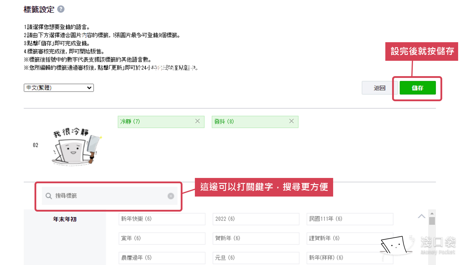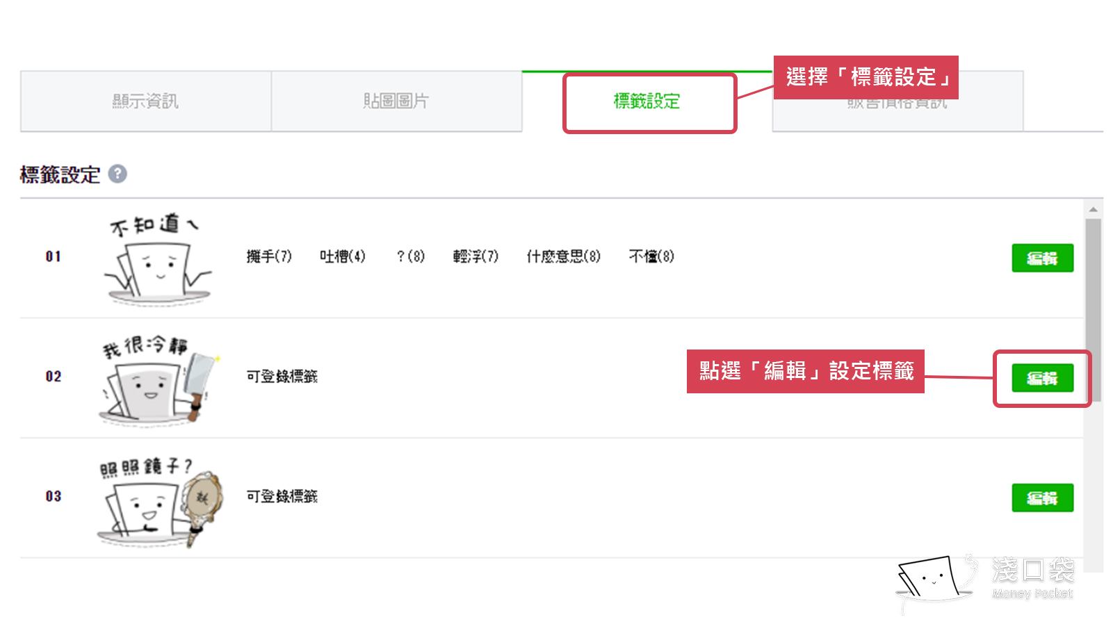 ▼ 6.貼圖上傳完後按「返回」回到主頁面,點選「標籤設定」,這一步非常重要阿!適合的標籤可以增加你貼圖的曝光度,所以大家要記得盡量要把貼圖都登錄標籤喔!
