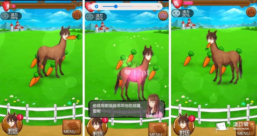 每一關場景副本所使用到道具都不一樣,一開始前兩關為了要訓練馬讓他長更多肌肉,會在草原吃紅蘿蔔用跑步機之類xd 當上面的愛心經驗值滿條就可以開啟新篇章,進入下一關。另外像左上角的活力值就是決定,使用道具時會加多少愛心值,活力越低能累積的就越少,而活力值可以透過左下的對話來增加~